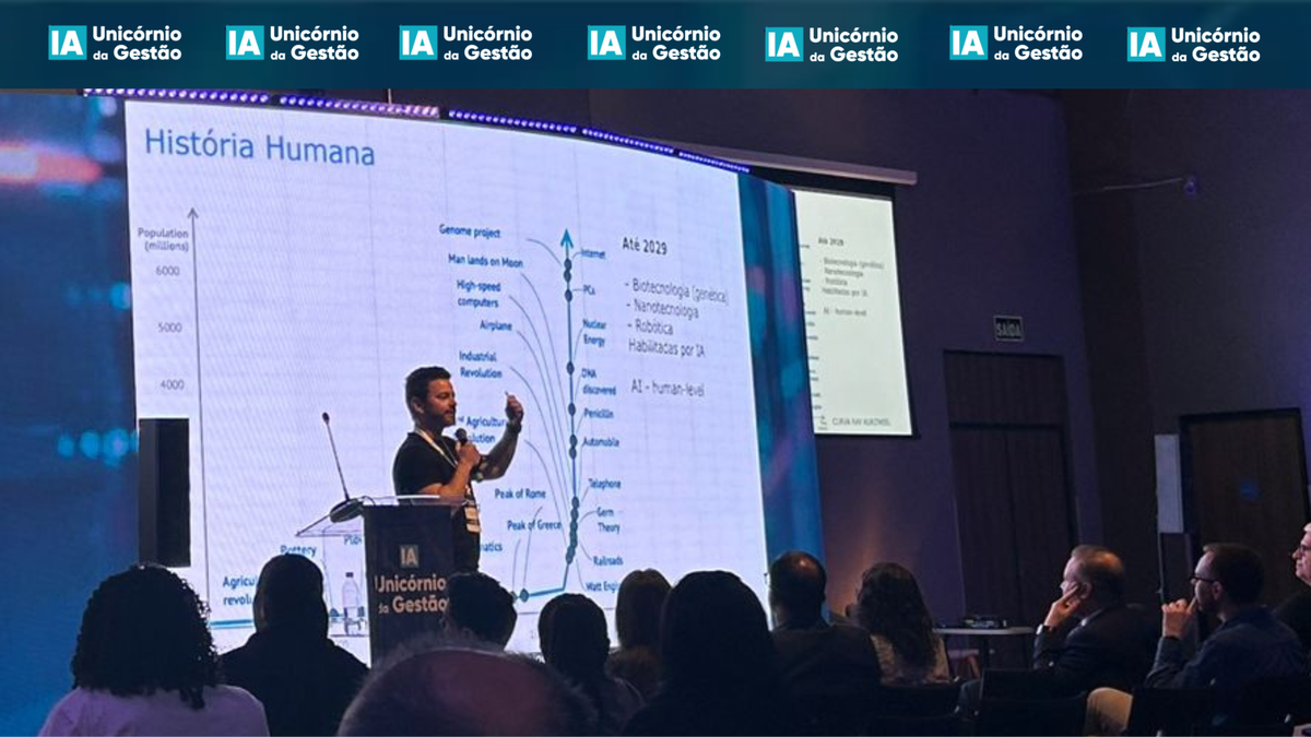 Entre as previsões de Ray Kurzweil citadas pelo palestrante, ele comentou sobre a relação que o inventor traçou entre o surgimento de novas tecnologias e o aumento do PIB global. "Estamos tendo a melhor oportunidade agora, pois o maior crescimento está ligado à IA", afirmou. E muito longe de ser uma evolução "da noite para o dia", o desenvolvimento da Inteligência Artificial começou há 70 anos. "Mas a grande sacada que rompeu os laboratórios de grandes empresas foi a Gen AI", afirmou.