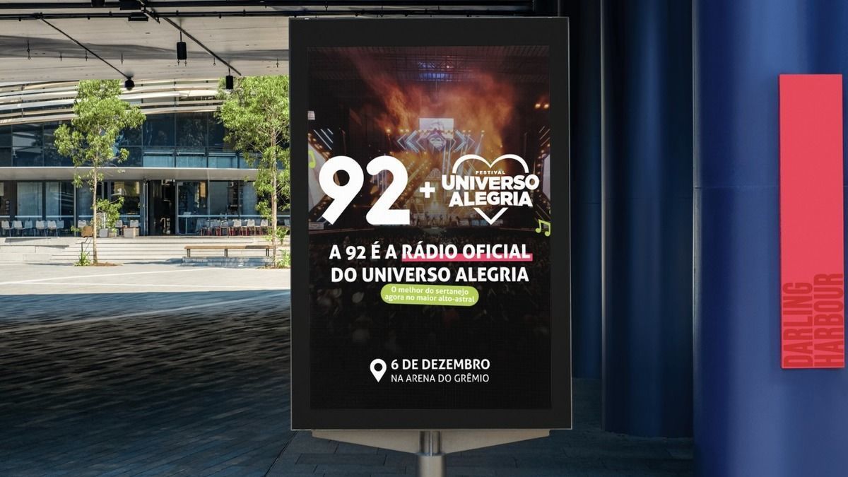 A rádio 92 é o veículo de Comunicação oficial do 'Universo Alegria', festival de música sertaneja, que será realizado em 6 de dezembro, na Arena do Grêmio (Avenida Padre Leopoldo Brentano, 110, bairro Farrapos), em Porto Alegre. Com a parceria, a emissora tem o objetivo de estar mais próxima do público do evento, principalmente no anúncio das atrações deste ano.
