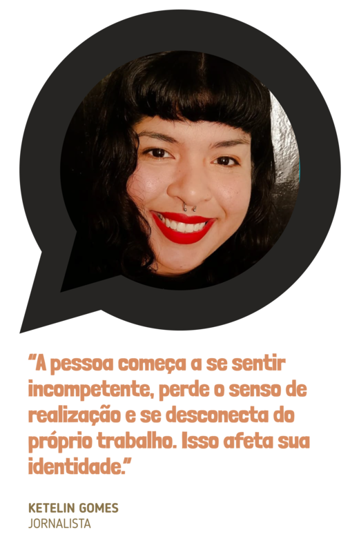 Quando ainda era estagiária Ketelin Gomes vivenciou este esgotamento em pleno início de carreira. Em 2023, com 27 anos, acumulava funções e enfrentava expectativas difíceis de cumprir. "Eu acordava às 4h para entrar às 6h, fazia o trabalho de duas ou três pessoas. Cobravam-me excelência em algo que eu não dominava, como edição de vídeo. Fui repreendida no grupo do trabalho com só 15 dias na função. Eu não dormia antes das 2h da manhã, revisando mentalmente o que não tinha dado conta de fazer."